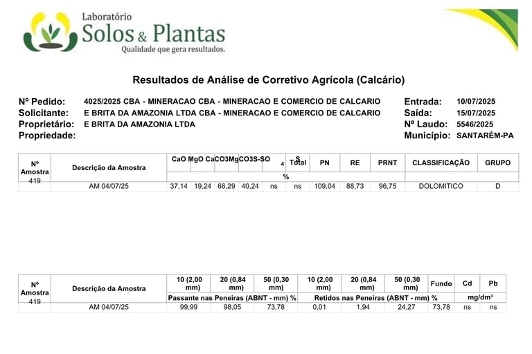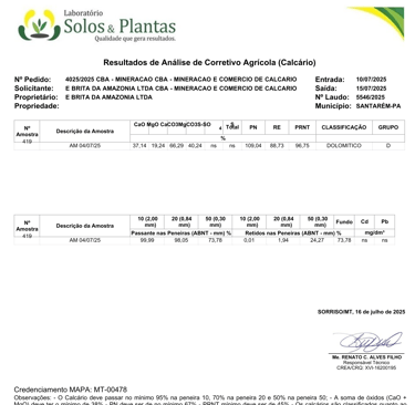 Com atuação forte em Santarém (PA), Roraima (RR) e Rondônia (RO), oferecemos calcário dolomítico e calcítico de alta qualidade, com PRNT de até 90% e teor de magnésio de até 16%, potencializando as lavouras do Norte do Brasil.